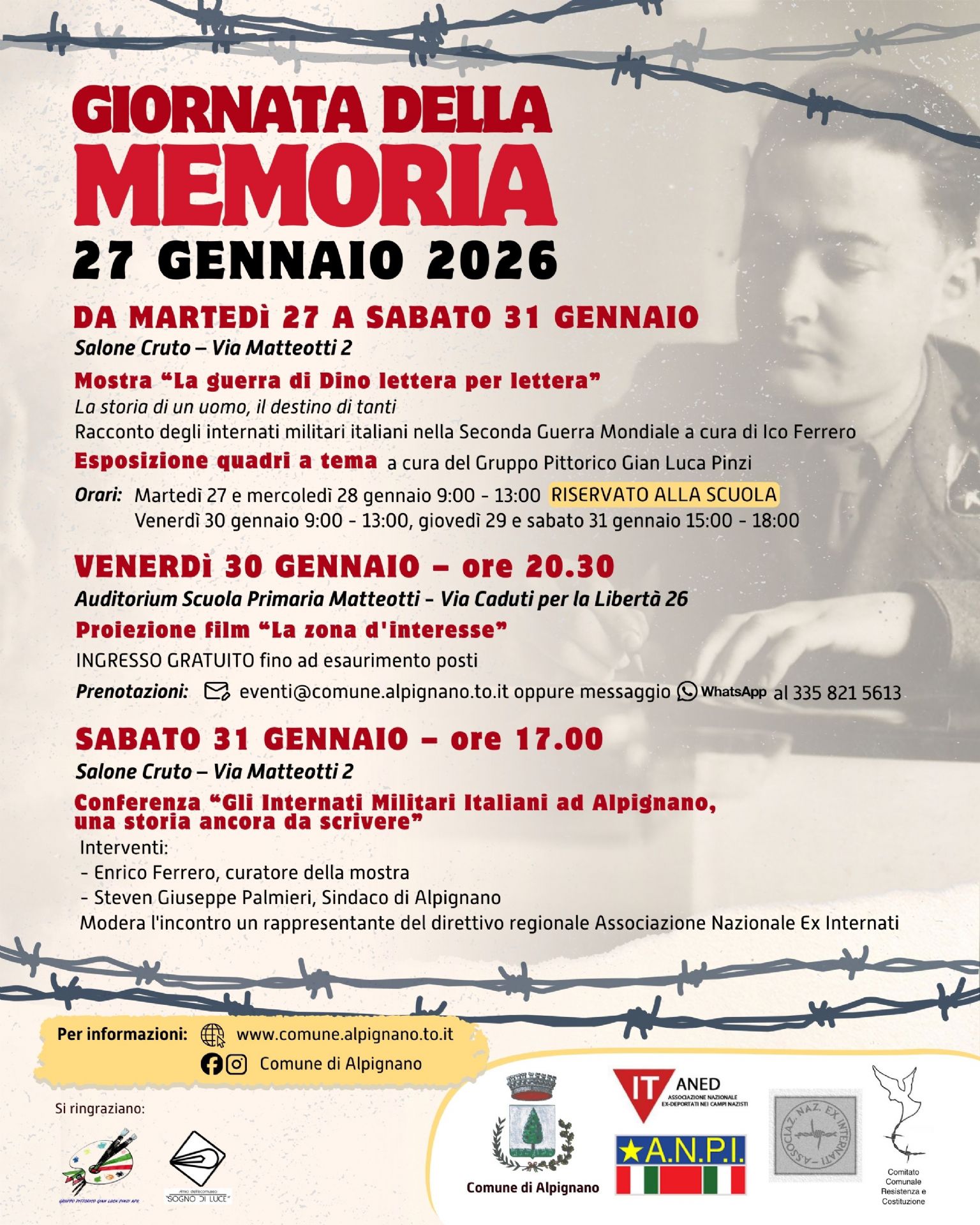 Da martedì 27.01.2026 a sabato 31.01.2026 una serie di iniziative organizzate dal Comune di Alpignano.