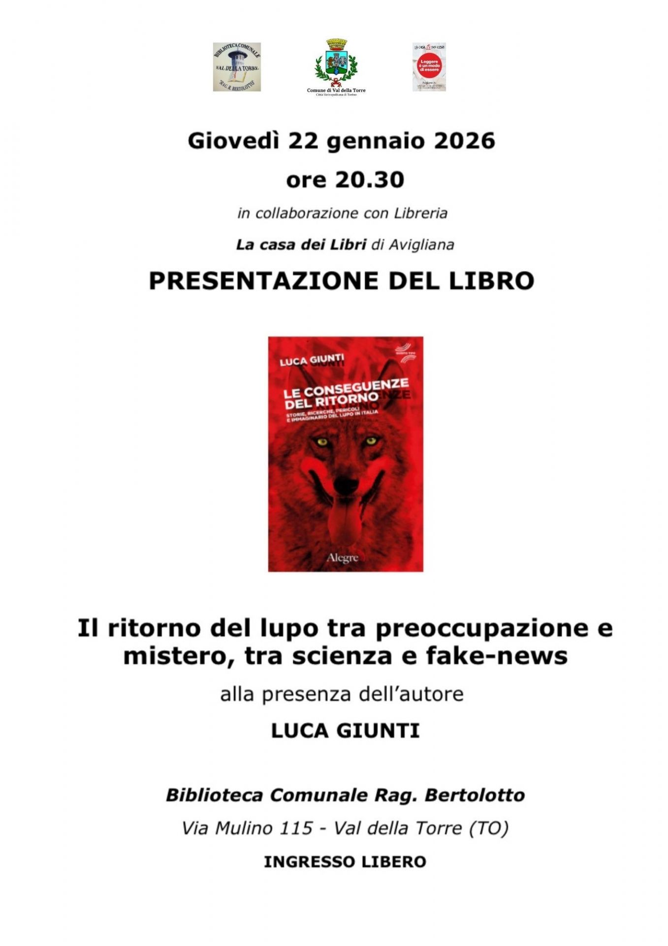 Giovedì 22.01.2026 ore 20.30 presso la Biblioteca Comunale.