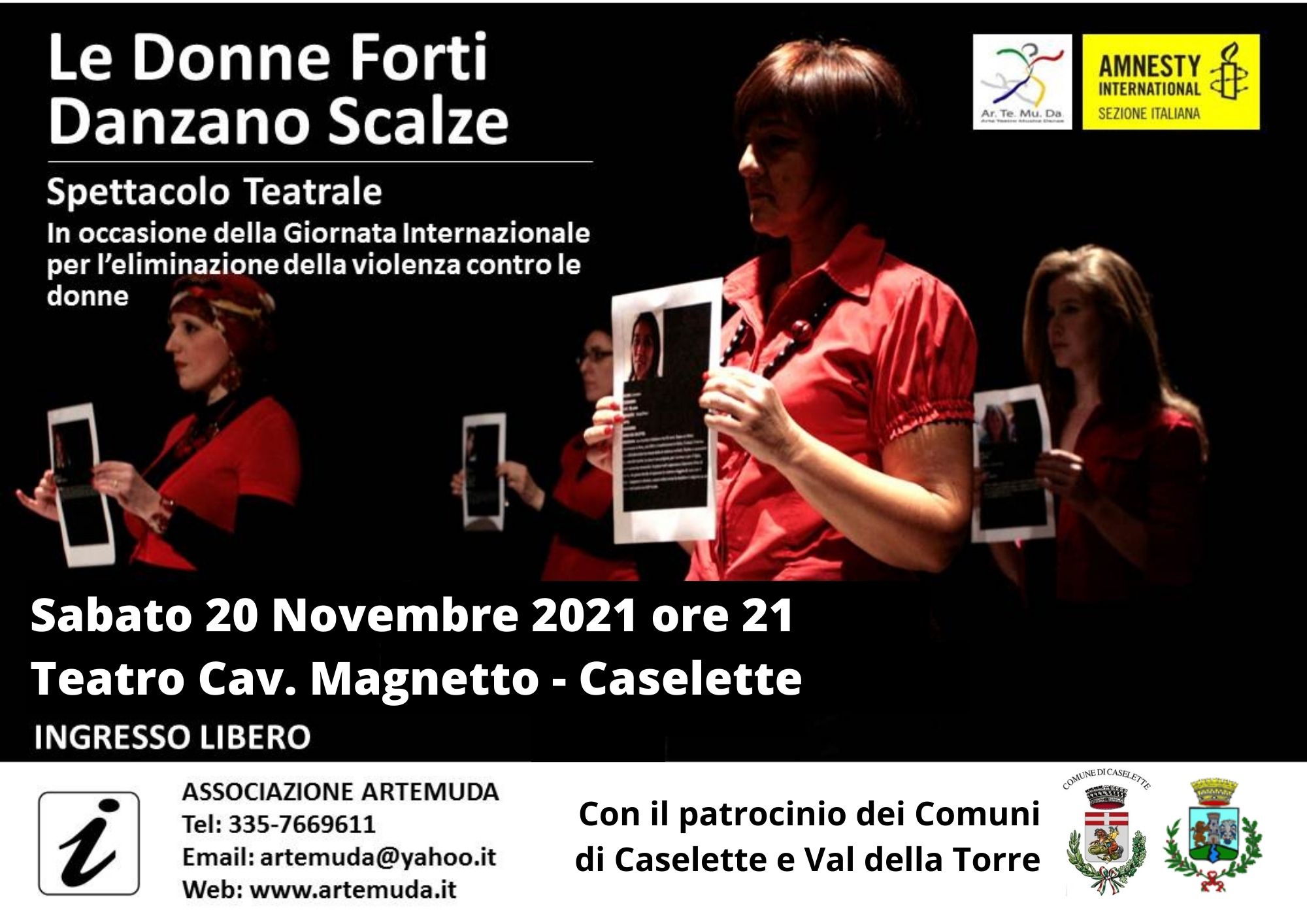In occasione di tale ricorrenza i Comuni di Caselette e Val della Torre, con l’Associazione ARTEMUDA, propongono per il giorno Sabato 20 Novembre 2021 ore 21:00, presso il Teatro Cav. Magnetto - Caselette uno spettacolo teatrale - "Le donne forti danzano scalze" - incentrato sulla storia di cinque donne (Hina, Juliette, Deborah, Isoke e Carmen) vittime di violenza di diverso tipo in cui si intravede un percorso comune.