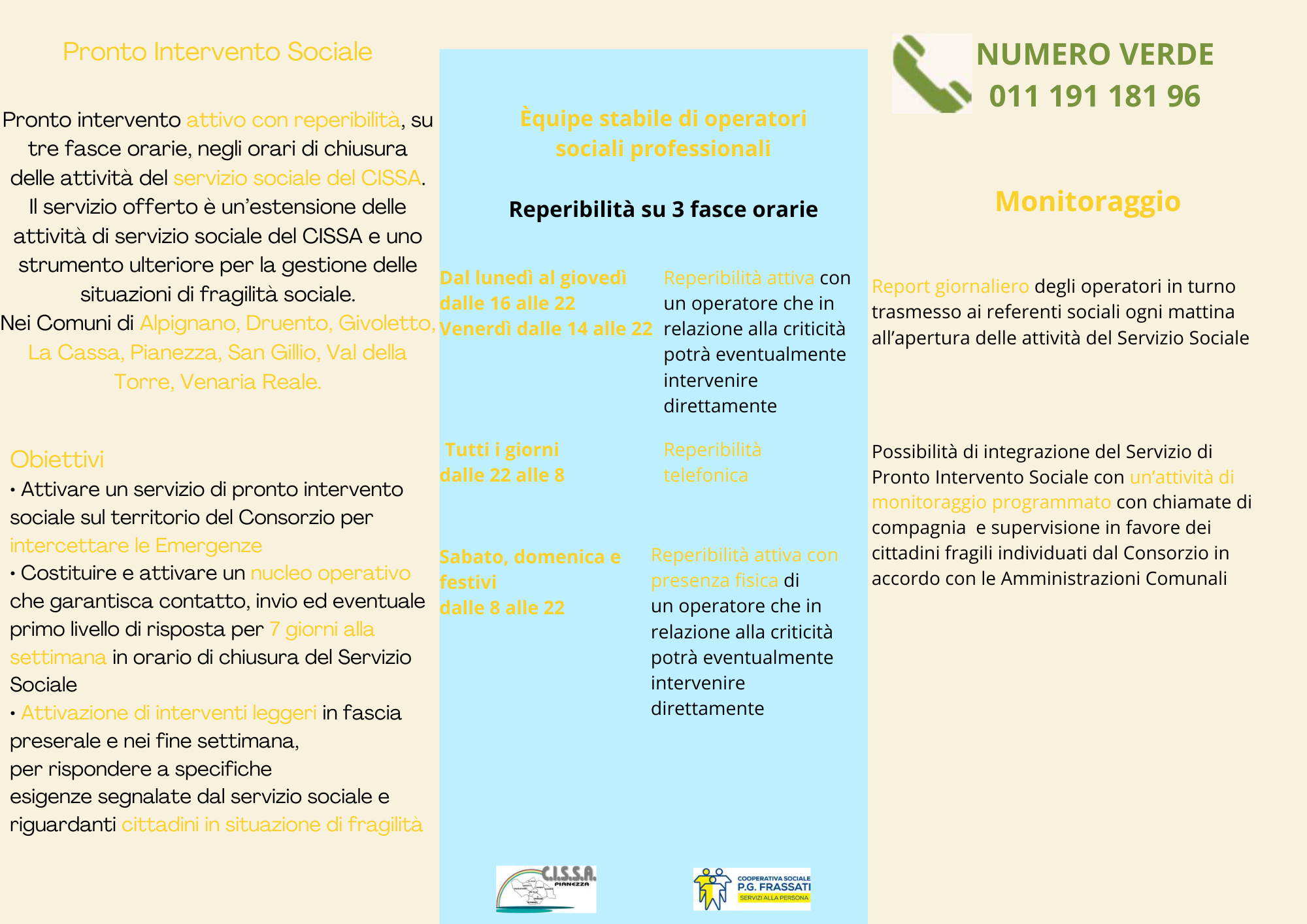 Il servizio di pronto intervento del Consorzio Intercomunale Servizi Socio Assistenziali risponde al numero verde 011 19118196 in orario di chiusura degli uffici. E' un servizio informativo e di orientamento gestito da un Nucleo operativo formato da un'equipe di operatori sanitari professionali che garantisce un contatto ed uno strumento per la gestione delle situazioni di fragilità sociale.